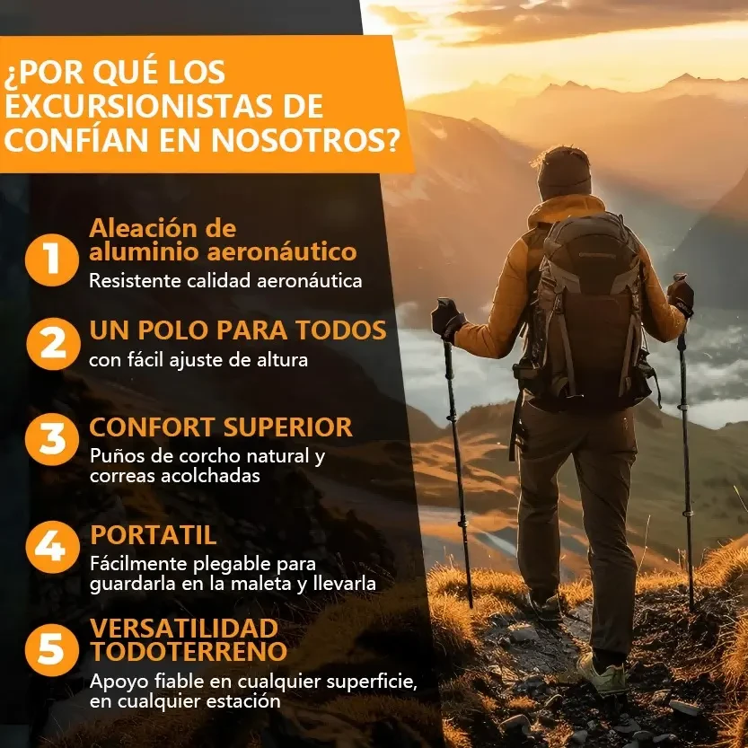DescripciónContenido del Paquete Bastón de Senderismo ×2 Bandana negra ×1 Mopa redonda ×6 Hebilla ×2 Cubrepies ×2 Cubrepies de Malla ×2 Pies de Acero al Tungsteno ×2 Cubrecalzado ×2 Bolsa de Tela ×1 Material: Aluminio de alta calidad. Peso: Cada bastón de trekking pesa solo 240 gramos. Ajuste de Largo: 62 a 135 cm. Bloqueo Rápido: Botón de bloqueo rápido y broche de aluminio. Plegables: Diseño compacto y fácil de transportar. ----------------------------------------------------------------------------------------------------- Ventajas del Producto Diseño extensible Los bastones de senderismo y bastones para montaña cuentan con un diseño telescópico y plegable de tres pliegues. Puedes ajustar libremente la longitud de 62 cm a 135 cm para adaptarse cómodamente a tu altura después de una fácil instalación. Ultraligeros y Resistentes Nuestros bastones de trekking y bastones trail running están hechos de aluminio de grado aeronáutico, que resiste mejor la presión y los impactos que la fibra de carbono.Un tratamiento de superficie crea un revestimiento protector contra la corrosión, proporcionando un alto nivel de resistencia.Se doblan de aluminio sin romper, lo que los hace ideales para senderismo de larga distancia y viajes donde la durabilidad es la principal preocupación. Diseño ergonómico para protección Nuestros bastones senderismo ofrecen una selección de altura adecuada y vienen con 5 formas diferentes de puntas de goma, lo que mejora la estabilidad en diferentes terrenos.El mango de espuma EVA absorbe el sudor, con un diseño de ranura antideslizante y cómodo.Las correas de muñeca son ajustables, lo que te permite relajar ligeramente tu agarre y transferir parte de la presión a tu brazo. Características Especiales Empuñadura de Corcho con función antichoque El mango de corcho de nuestros bastones para montaña ofrece una comodidad superior gracias a su excelente capacidad de absorción de humedad, manteniendo tus manos secas y cómodas en todo momento. Además, su agarre ergonómico está diseñado para adaptarse a la forma natural de tu mano, reduciendo la fatiga y proporcionando un agarre seguro incluso en largas caminatas. Aunque el corcho es notablemente ligero, es extremadamente durable y resistente al desgaste, garantizando una larga vida útil del producto.Una ventaja adicional es que, al no contar con un sistema de amortiguación, la transferencia de energía es más directa, permitiendo una mejor propulsión en cada paso.Este beneficio es especialmente apreciado por senderistas experimentados que prefieren sentir el terreno y maximizar su energía, especialmente en subidas empinadas. Con Mango EVA con Antishock Nuestros bastones de senderismo están diseñados para ofrecer la máxima comodidad y eficiencia en cada paso de tu aventura al aire libre. Equipados con un mango de EVA, proporcionan un agarre suave y cómodo al tacto, ideal para largas caminatas.El material EVA no solo ofrece una sensación agradable, sino que también es excepcional en la absorción de impactos, reduciendo las vibraciones y el impacto en tus manos y muñecas para que puedas disfrutar de una experiencia de senderismo con menos molestias y fatiga. La absorción de impactos también se ve potenciada por nuestro avanzado mecanismo de antishock, que absorbe eficazmente el impacto generado al caminar sobre terrenos irregulares. Este sistema reduce significativamente la presión sobre las articulaciones, especialmente en las rodillas, caderas y tobillos.Esta característica es una ventaja clave para quienes buscan proteger sus articulaciones durante caminatas prolongadas, disminuyendo la fatiga y el riesgo de lesiones, proporcionando mayor comodidad durante toda la travesía. |