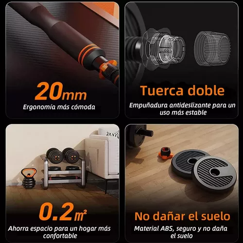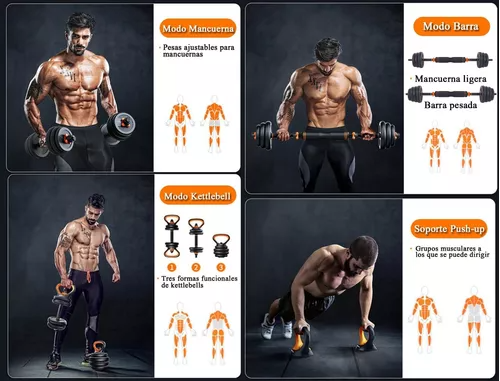 Nuestro set 6 en 1 de mancuernas y barras puede satisfacer todas sus necesidades, puede hacer sentadillas, peso muerto, curl, press de suelo, press de hombros, curl de tríceps y todo tipo de ejercicios en casa en cualquier momento y lugar.
