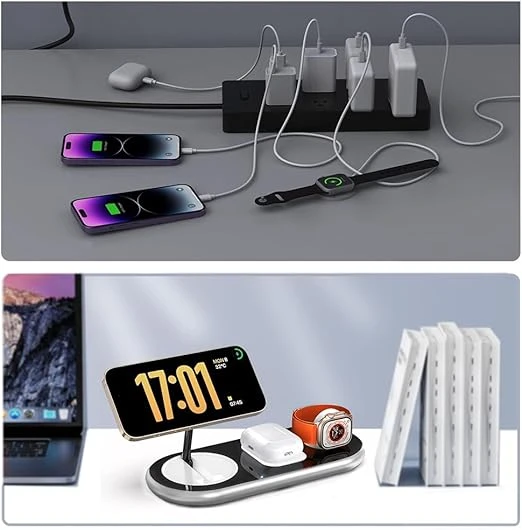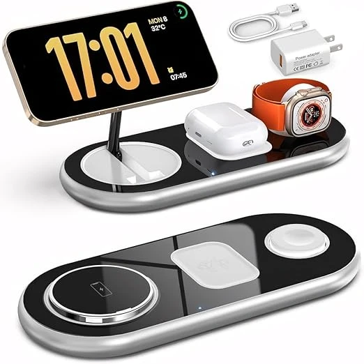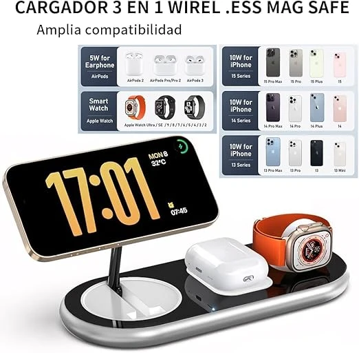 Cargador Inalámbrico Magnético 3 en 1 con Adaptador de 18W, Estacion de Carga Compatible con MagSafe para iPhone 13/14/15/Plus/Pro/Pro MAX, Apple Watch Ultra 9/8/7/SE/6/5/4/3/2, AirPods Pro 3/2