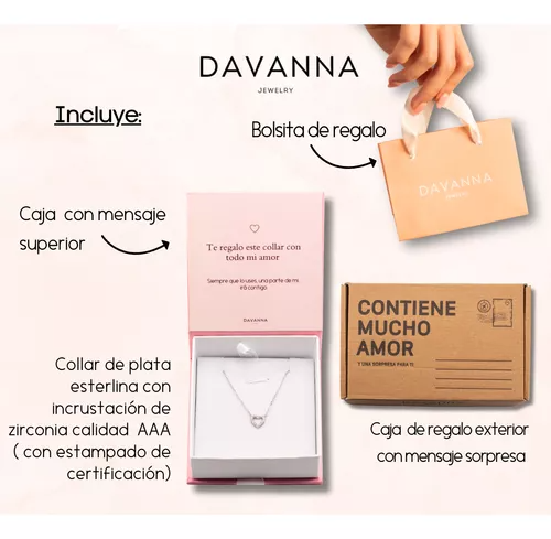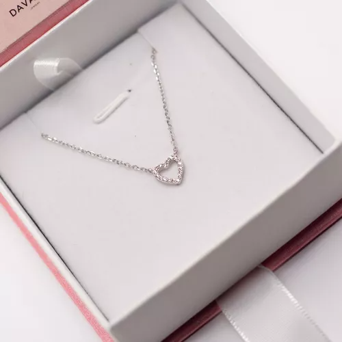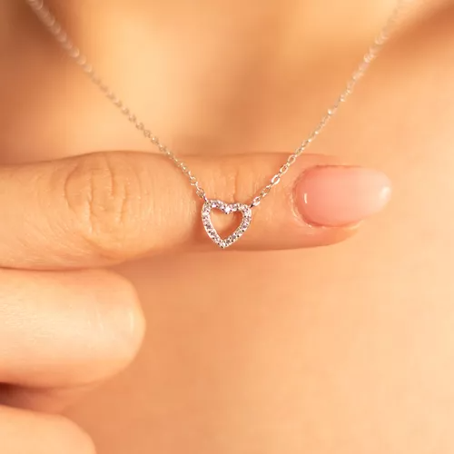 Este collar es una pieza de joyería fina, su delicado dije en forma de corazón, adornado con brillantes incrustaciones de zirconia, captura la luz de una manera que refleja la pureza y la profundidad del amor verdadero.