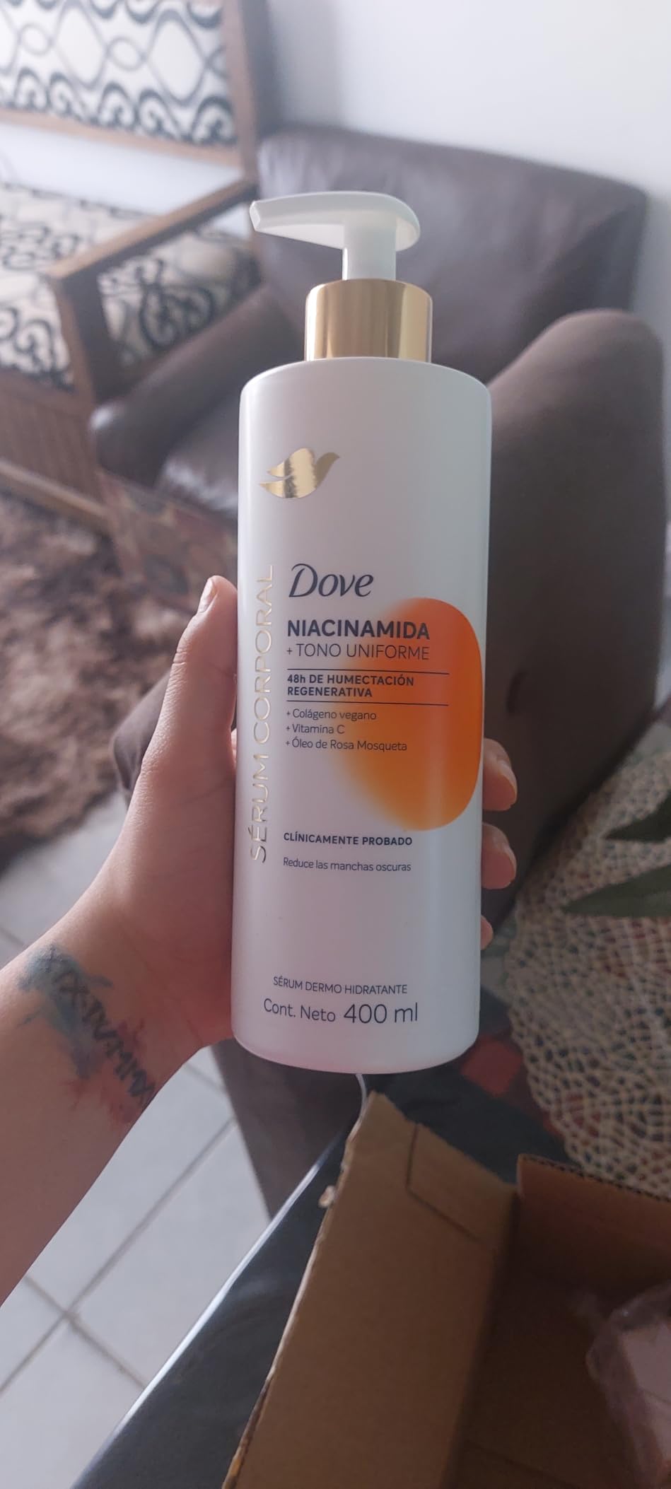 Instrucciones Aplicar sobre la piel. Dejar actuar hasta que se absorba el producto Descripción del productoDescubre la suavidad e hidratación del Sérum Corporal Dove Niacinamida + Tono Uniforme que trabaja con tu piel para recuperar su tono natural y eliminar la resequedad, dándole 48 horas de humectación, gracias a que contiene una fórmula de fácil aplicación enriquecida con colágeno vegano***, que ayuda a promover la firmeza, soporte y resistencia de la piel vitamina C, que ayuda a proteger la piel de los radicales libres disminuyendo las manchas obscuras, y óleo de rosa mosqueta 100 % natural, que junto con la vitamina C ayuda a igualar el tono de tu piel para que vuelva a lucir hermosa y radiante. Dale a la piel de tu cuerpo el mismo cuidado que a la piel de tu cara con los sérums corporales de Dove, co-creados con dermatólogos usando fórmulas intensivas, de fácil aplicación, clínicamente probadas y enriquecidas con ingredientes que se absorben rápidamente y fórmulas de uso diario con una alta capacidad de penetración que aportan nutrientes y activos a las capas profundas de la piel*, actuando de adentro hacia afuera* para dejar tu piel radiante y tan suave como Dove. En Dove nos preocupamos por tu piel y por el planeta. Desde hace más de 25 años estamos comprometidos a brindarte la protección y el cuidado que necesitas sin dejar de cuidar el medio ambiente. Únete a nosotros en nuestro compromiso por reducir el desperdicio y preservar nuestros recursos. Cada elección cuenta. Juntos, podemos proteger nuestra piel y el mundo que amamos. Cuidemos de ti y del planeta con Dove. *Estrato córneo. **Estudio clínico. Manchas causadas por el sol. ***SH-Polypeptide-121. |