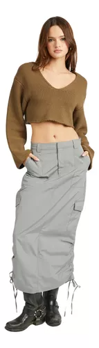 El corte de la falda es recto, y su largo hasta los tobillos le confiere una silueta moderna y estilizada, ideal para quienes buscan una prenda que alargue la figura y a la vez sea cómoda para el día a día. Uno de los elementos más llamativos son los bolsillos de carga ubicados a ambos lados, típicos del estilo cargo, que no solo aportan un elemento visual interesante sino que también son prácticos para llevar pequeños objetos, logrando un equilibrio entre moda y funcionalidad. Este detalle hace que la falda se sienta robusta y utilitaria, manteniendo la esencia de una prenda moderna y vanguardista.