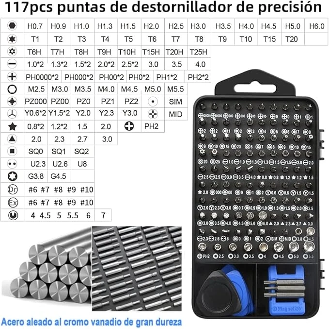 - 【Material de Alta Calidad】98 piezas de puntas de desarmador reemplazables están hechas de material CR-V de alta calidad con dureza 55-66HRC, con alta precisión y buena tenacidad, haciendo que las puntas sean más precisas y no dañen el equipo.