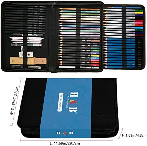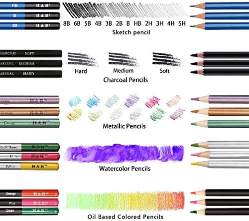 - Suministros de dibujo: El juego de lápices de dibujo H&B 72 incluye 12 lápices de acuarela de colores, 12 lápices de colores, 12 lápices de dibujo, 12 lápices de colores metálicos de colores, 12 lápices de carbón, 1 lápiz de carbón blanco, 1 bloc de bocetos A5, cada lápiz está marcado con nombre y modelo de color