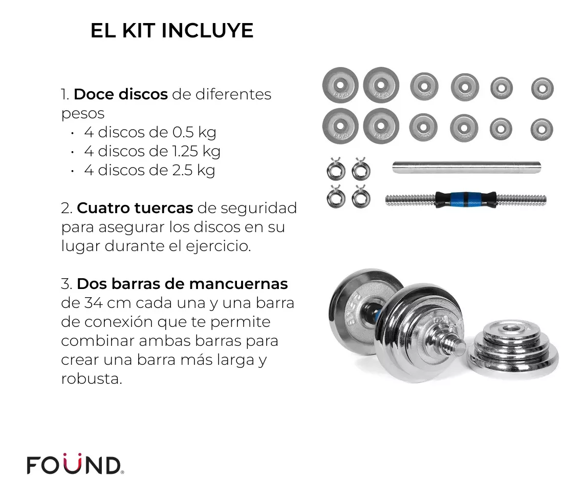 Ver todas las características DescripciónEste kit de mancuernas es ideal para ejercitarse en casa y es adecuado tanto para principiantes como para usuarios más avanzados. Con una capacidad total de 20 kg, el kit incluye 2 barras de mancuernas de 34 cm cada una y una barra de conexión para combinar ambas barras en una más larga y robusta. Se incluyen 4 tuercas de seguridad para fijar los discos durante el ejercicio. |