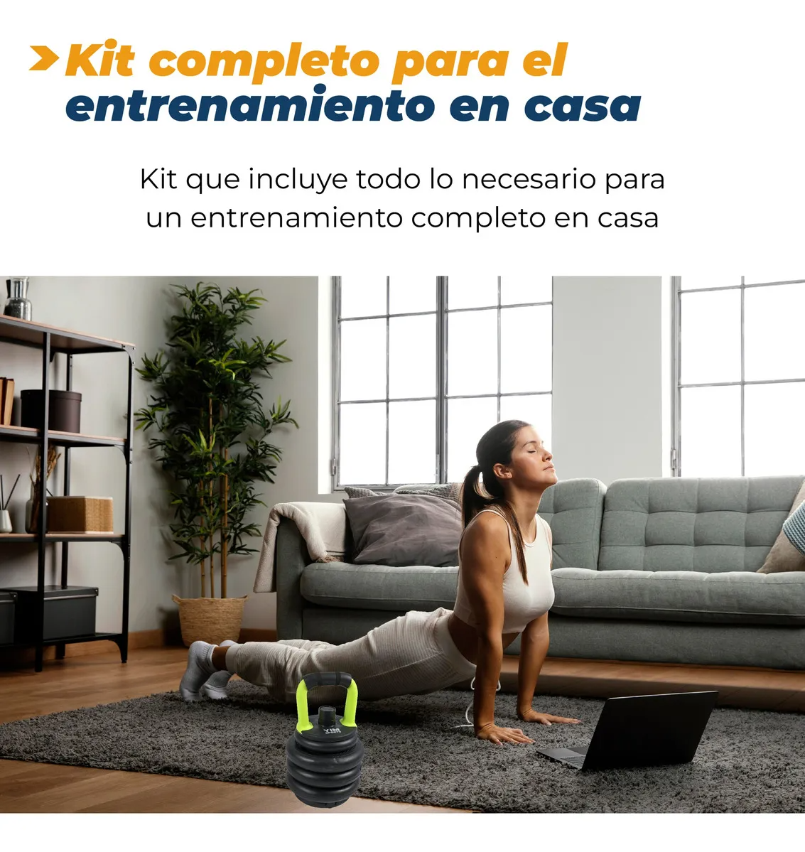 Arma 2 mancuernas, una rueda de resistencia para abdomen, una pesa rusa con la que podrás realizar sentadillas, peso muerto, soportes para push-up y más.