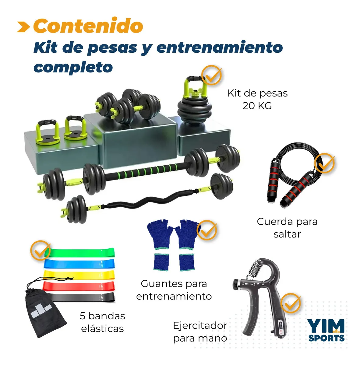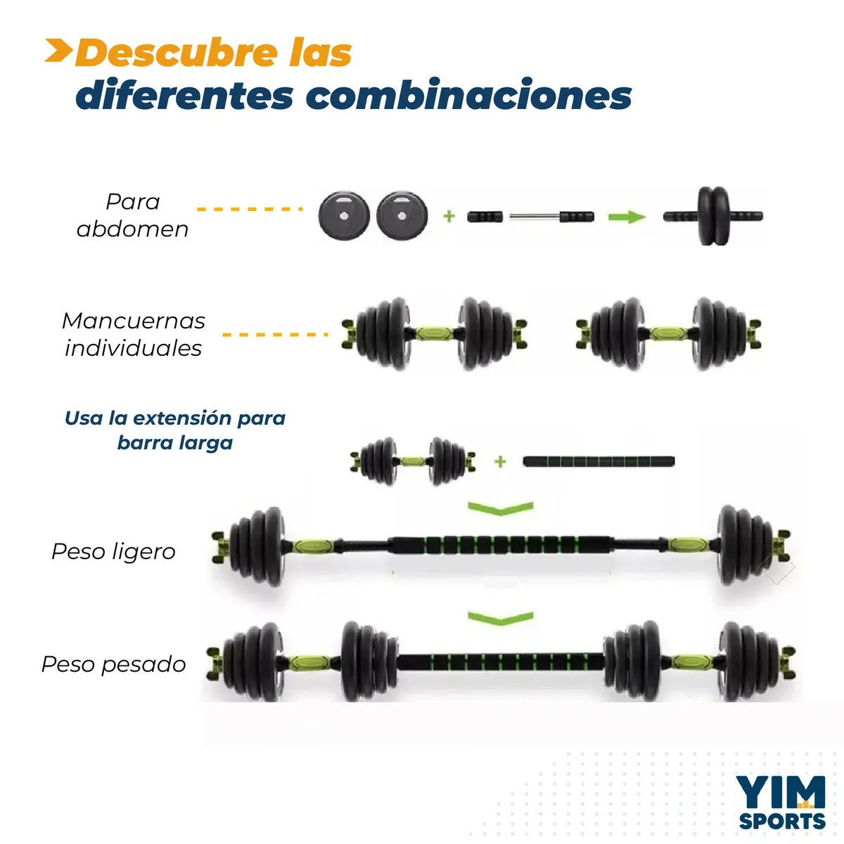 Un kit completo de mancuernas para complementar tu equipo de entrenamiento y poner a prueba tu fuerza y resistencia desde tu hogar con carga máxima de 20kg.