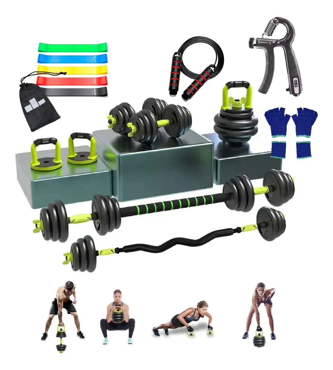 - Intercambia, une y juega con el peso de hasta 20kg (El peso completo con mancuernas, barra y pesa, es de 21kg) para realizar múltiples ejercicios y accesorios.