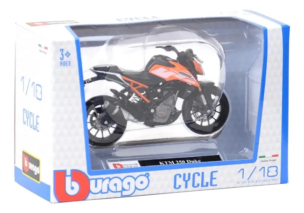 KTM Duke 250 Escala 1:18 Bburago ¡Una moto referente en el segmento! Especificaciones Material: Tanque de metal, carenado de plástico, llantas de goma. Dirección y suspensión trasera funcionales. - Dimensiones (centímetros): 11.5 x 6.2 x 4.8 - Escala: 1/18 - Color: Naranja - Marca: KTM |