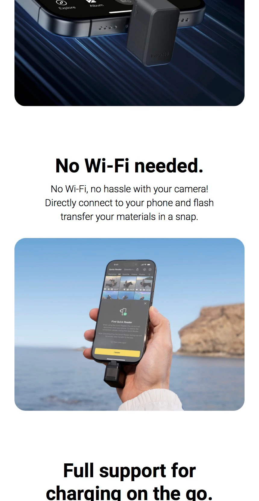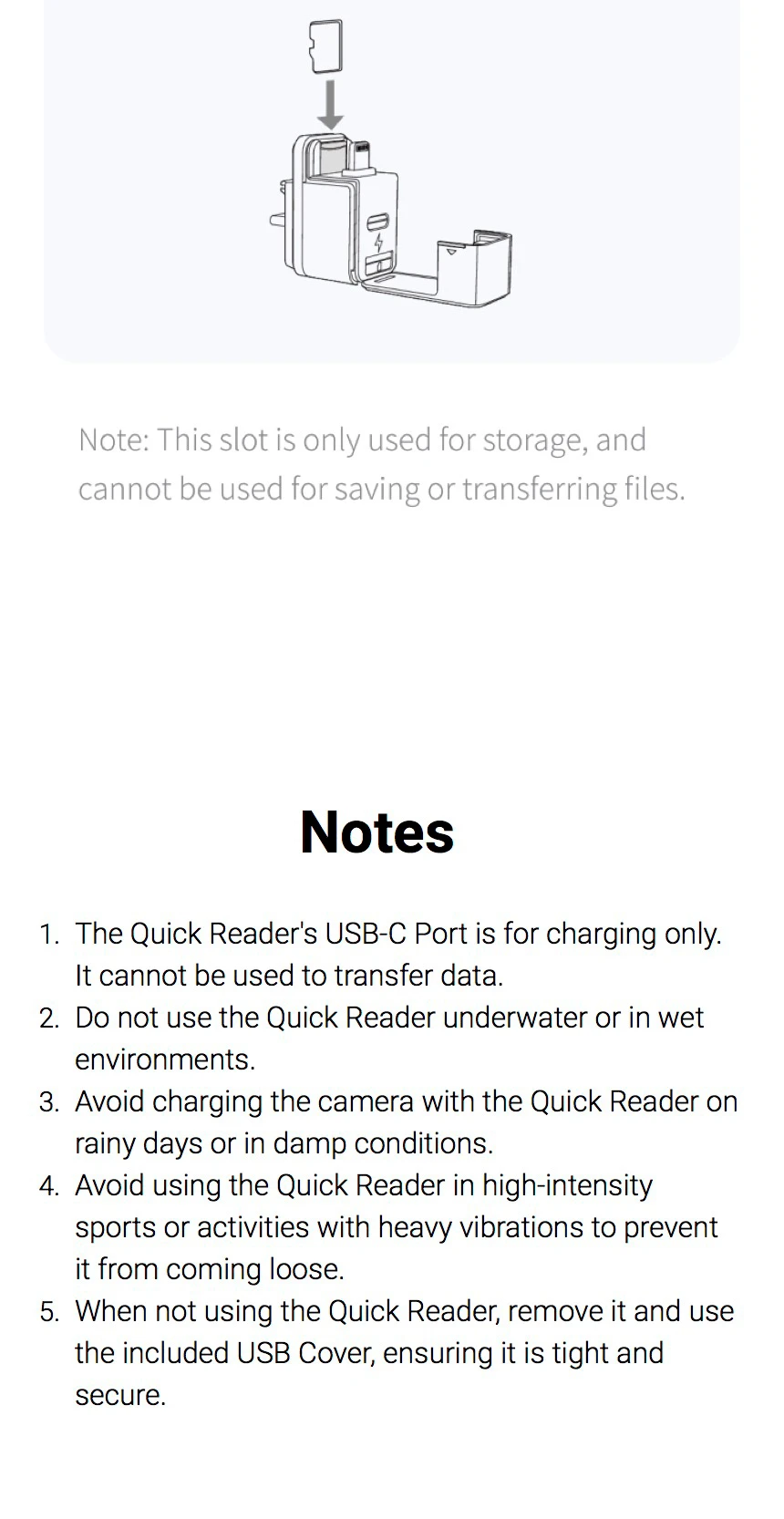 Adicional de ranura de memoria : Asegura más almacenamiento con ranura extra para tarjetas, ideal para capturas prolongadas. Portátil de carga USB-C:Incluye puerto USB-C para cargar su teléfono mientras trabaja con Insta360 X5. Diseño dual compatible:Compatible con iOS y Android, el lector insta360 x5 es versátil y fácil de usar. Transferencias USB-3.0 rápidas:Transfiere archivos grandes a una velocidad superior, optimizando el tiempo de trabajo. Conexión plug and play:Conéctese directamente a su teléfono para editar y exportar de forma rápida y sin complicaciones. Detalles