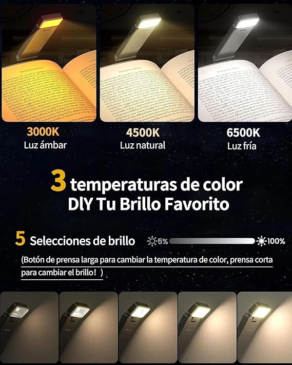- 【5 Modos de Luz】Borfish lámpara de lectura tiene 3 modos de temperatura de color para elegir: luz ámbar (3000K), luz mixta (4500K), luz blanca (6500K) y 5 modos de brillo ajustables, elija el modo más adecuado según sus necesidades. La tecnología de pantalla esmerilada emite una luz suave sin parpadeos ni deslumbramientos, filtra el 99,9% de la luz azul para reducir la fatiga ocular durante sesiones de lectura prolongadas.