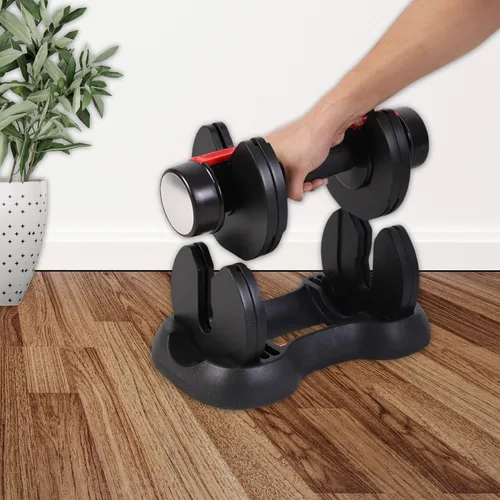 DISEÑO COMPACTO PARA AHORRAR ESPACIO: Este set de mancuernas ajustables reemplaza la necesidad de múltiples juegos de pesas, combinando 15 mancuernas en una sola unidad, manteniendo tu área de entrenamiento ordenada y eficiente.