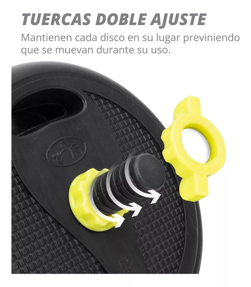 SEGURO DE USAR. El set contiene 8 tuercas de seguridad que mantienen cada disco en su lugar previniendo que estos se muevan durante su uso. El mango de las mancuernas está forrado de goma antideslizante para asegurar un mejor agarre.