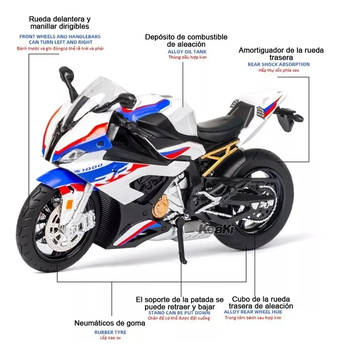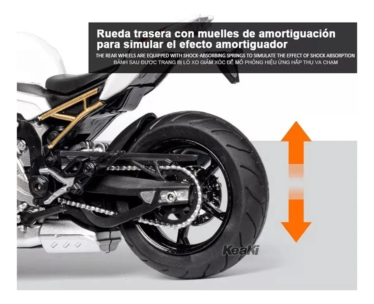 -Especificación del productoNombre del producto: Modelo de coche de aleación en miniatura S1000RREscala del producto: 1:12Tamaño del producto: 17,5*5*10 cmPeso del producto: 203 gMaterial: aleación, ABS, goma, componentes electrónicosProceso de forja: fundición a presión Color: azul y blancoCaracterísticas: el soporte se puede bajar para que el modelo se ponga de pie; la rueda delantera y el manillar se pueden dirigir a la izquierda y a la derecha; sistema de amortiguación de la rueda trasera simulado; con tablero de visualización para que puedas mostrarlo en cualquier lugar.-Diseño detallado y realista, inspirado en la moto real.-El modelo es adecuado para aficionados y coleccionistas, así como para aquellos que aprecian las motos y la libertad en su diseño. |