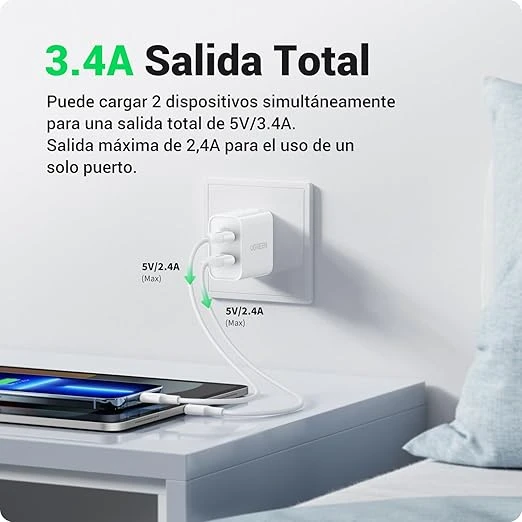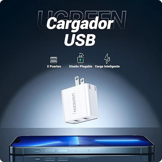 | Marca | UGREEN | | Tecnología de conectividad | USB | | Tipo de conector | USB | | Dispositivos compatibles | Cámaras, Tablets, Smartphone, Smartwatches | | Modelos de teléfonos compatibles | Compatible con iPhone XS X XR, 8, 7, 6S, 6plus, SE, 5S, iPad Pro Air Mini, Xiaomi, Huawei, motorola, LG, Celular Android y Windows, Tablet, EBook, MP3, Cámara y otros Dispositivos USBCompatible con iPhone XS X XR, 8, 7, 6S, 6plus, SE, 5S, iPad Pro Air Mini, Xiaomi, Huawei, motorola, LG, Celular Android y Windows, Tablet, EBook, MP3, Cámara y otros Dispositivos USB | | Componentes incluidos | 1 cargador USB de 2 puertos, 1 manual de usuario (idioma español no garantizado) | | Característica especial | Viaje, Carga rápida | | Color | Blanco | | Voltaje de entrada | 240 Voltios | | Tipo de montaje | Montaje en pared |