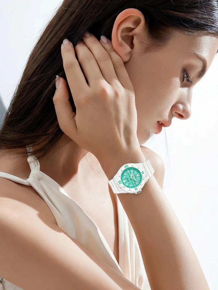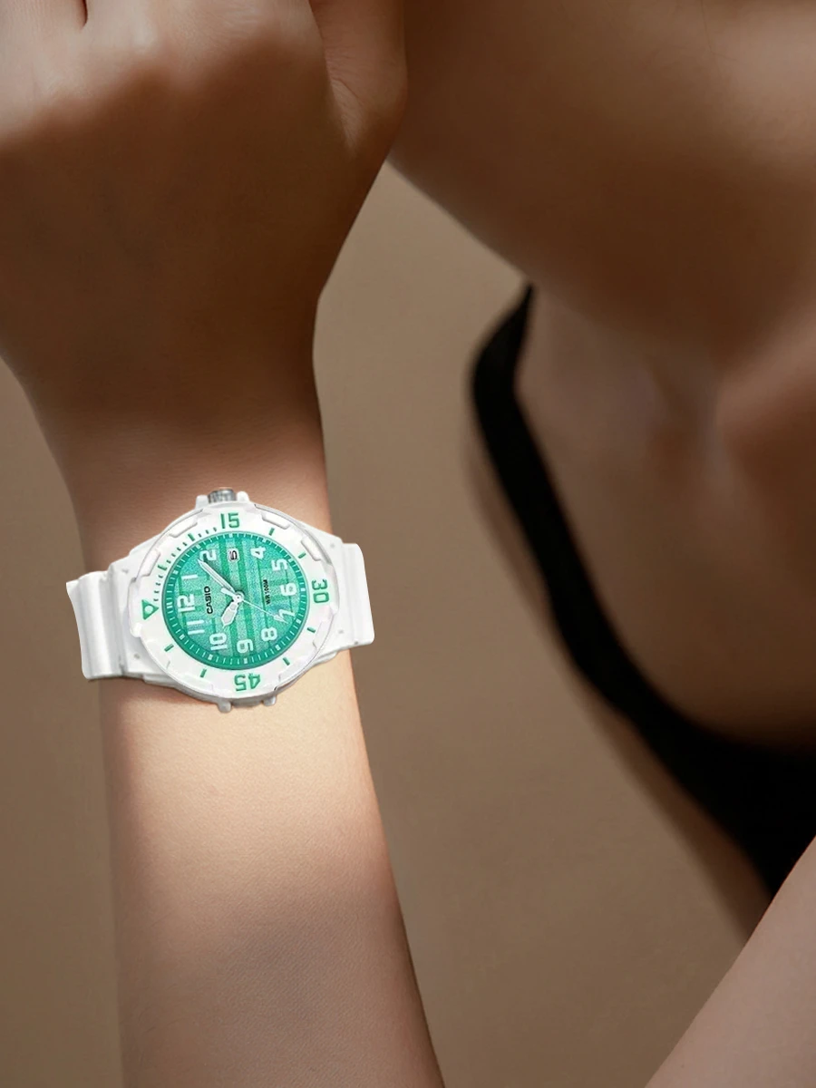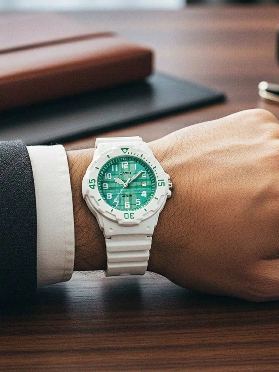 DescripciónUn soplo de aire fresco para tu muñeca Abraza las vibras frescas del verano con este reloj deportivo verde menta y blanco. Su diseño limpio y su toque de color lo convierten en una pieza versátil que alegra cualquier atuendo, desde uniformes escolares hasta ropa casual de fin de semana. Está todo en los detalles Lo que distingue a este reloj es el patrón de cuadros texturizado en la esfera verde. Capta la luz de forma sutil, dándole al reloj una sensación premium que va más allá de los colores planos estándar. Diseñado para el día a día. Tamaño compacto: Se ajusta perfectamente a muñecas más pequeñas (aprox. Caja de 33 mm. Manecillas luminosas: te ayudan a ver la hora en condiciones de poca luz. Bisel giratorio: Añade un toque deportivo, inspirado en los relojes de buceo (bidireccional). Material de la caja: Resina blanca brillante Color de la esfera: Verde / Rosa Función: Hora analógica + Fecha Correa: Banda de resina ajustable |