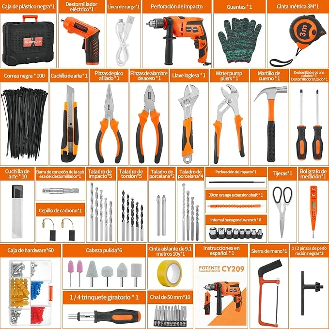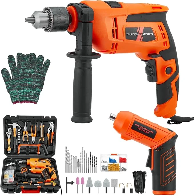- Juego de Rotomartillo 244PCS:Este kit de herramientas de 244 piezas encuentran martillos, alicates, destornilladores planos y Phillips, cinta métrica, tijeras, juego de llaves Allen, navaja y mucho más. Todas las herramientas están fabricadas con acero al cromo-vanadio forjado a alta temperatura, de gran calidad, para conseguir fuerza, dureza, durabilidad y resistencia a la corrosión.