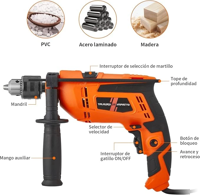 - Rotomartillo 1/2": El botón en la parte superior del taladro percutor con cable, elija la función de impacto o taladro según la tarea; la función de taladro se usa para perforar placas de acero, madera y cemento, y la función de martillo proporciona más impacto para hacer paredes y ladrillos. Las tareas de perforación de piedra son más eficientes y fáciles.
