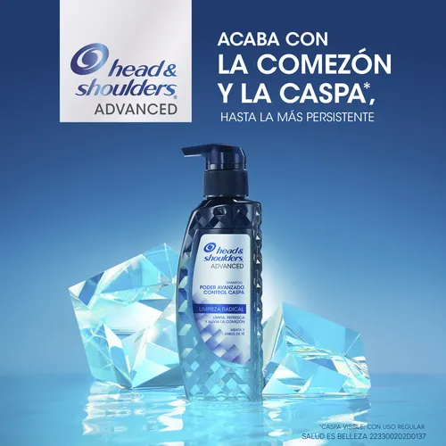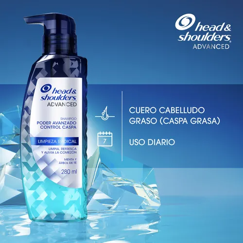Características del productoMarca: Head & Shoulders Presentación: Dosificador Edad: Adultos Tipo: Shampoo Formato de venta: Unidad Género: Sin género DescripciónLa línea Head & Shoulders Advanced presenta la fórmula anticaspa más eficaz de la marca. Su ingrediente activo penetra incluso en las áreas más difíciles, proporcionando una protección completa y efectiva contra la caspa* por hasta 72 horas, incluso contra la caspa más persistente. Desde el primer uso, reduce la comezón**. Ofrece una limpieza profunda, alivio inmediato de la comezón** y una sensación de frescura. Ideal para personas con cuero cabelludo graso (caspa grasa). El uso diario de Head & Shoulders Advanced Limpieza Radical proporciona la protección anticaspa y el cuidado necesario para mantener la salud del cuero cabelludo y el cabello. |