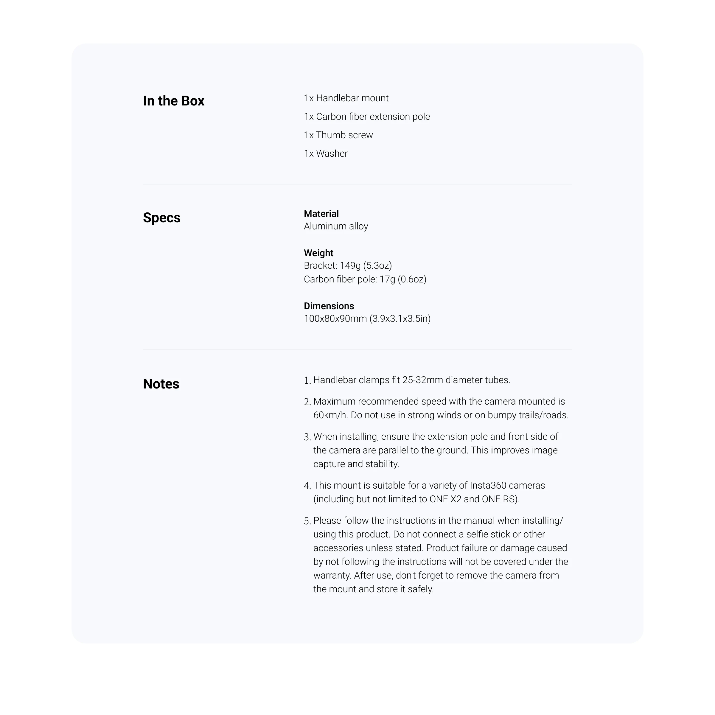 Accesorios Insta360 X5|Soporte Manillar Bici|Compatibilidad amplia:Compatible con Insta360 X5/X4/X3 y ONE RS/X2, ideal para una variedad de cámaras. Accesorios adicionales : Incluye dos puntos de conexión adicionales para ampliar la funcionalidad de su soporte para Insta360. Bicicleta Persona|Compatibilidad amplia:Soporte para Insta360 X3, X4, X5 y ONE RS, ideal para diversas cámaras 360°. Bicicleta Persona|Soporte Para Camara Insta360|Compatibilidad amplia:Apto para Insta360 ONE X2/X/R/RS, asegura una amplia gama de cámaras 360°. Capturas de tercera persona : Optimizado para ONE X2 y ONE RS, ofrece fotos de ciclismo únicas. |