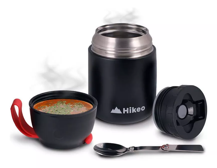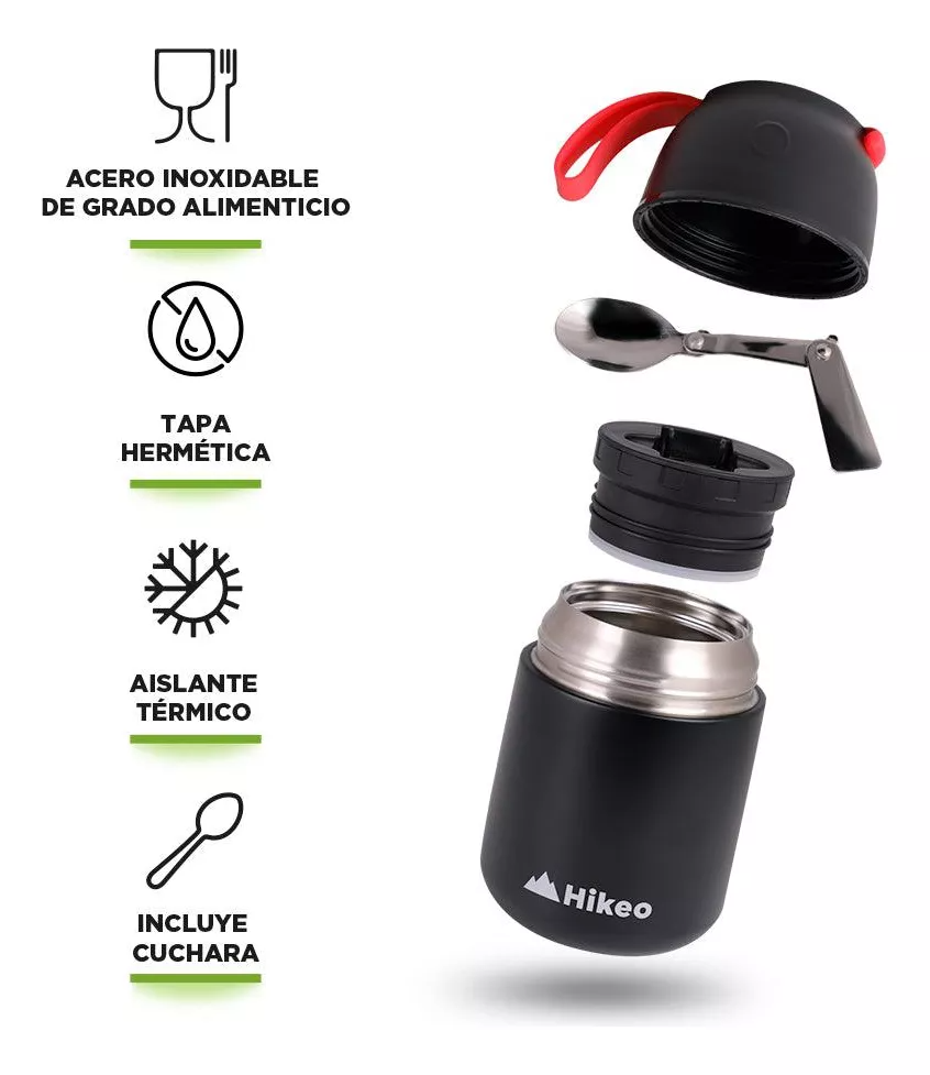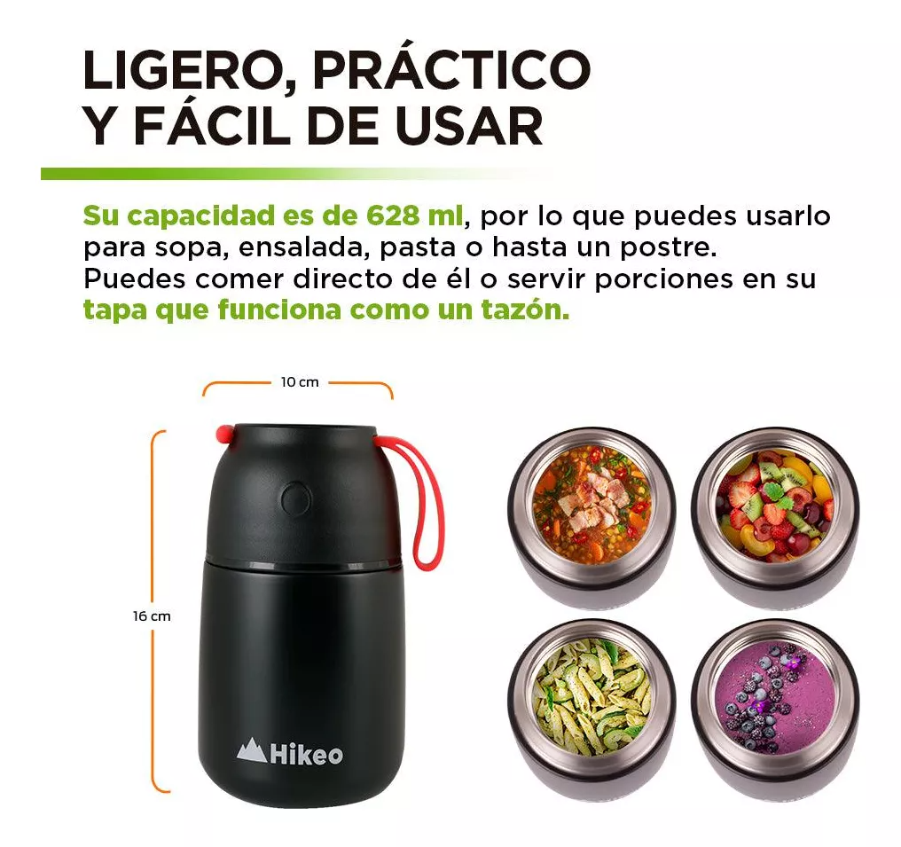 Te encantará que tiene tamaño compacto para cargar con él a donde sea, pero le cabe más de medio litro de sopa. Cuenta con un sello hermético interior, una tapa que sirve como tazón y una cuchara plegable para disfrutar tu comida en el momento que quieras.