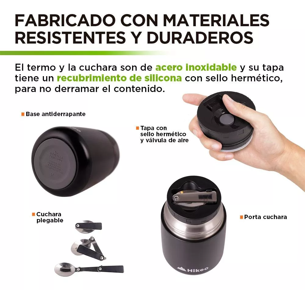 FABRICADO CON MATERIALES DE LA MEJOR CALIDAD DE GRADO ALIMENTICIO: El termo y la cuchara son de acero inoxidable grado alimenticio y su tapa tiene un recubrimiento de silicona con sello hermético para no derramar el contenido