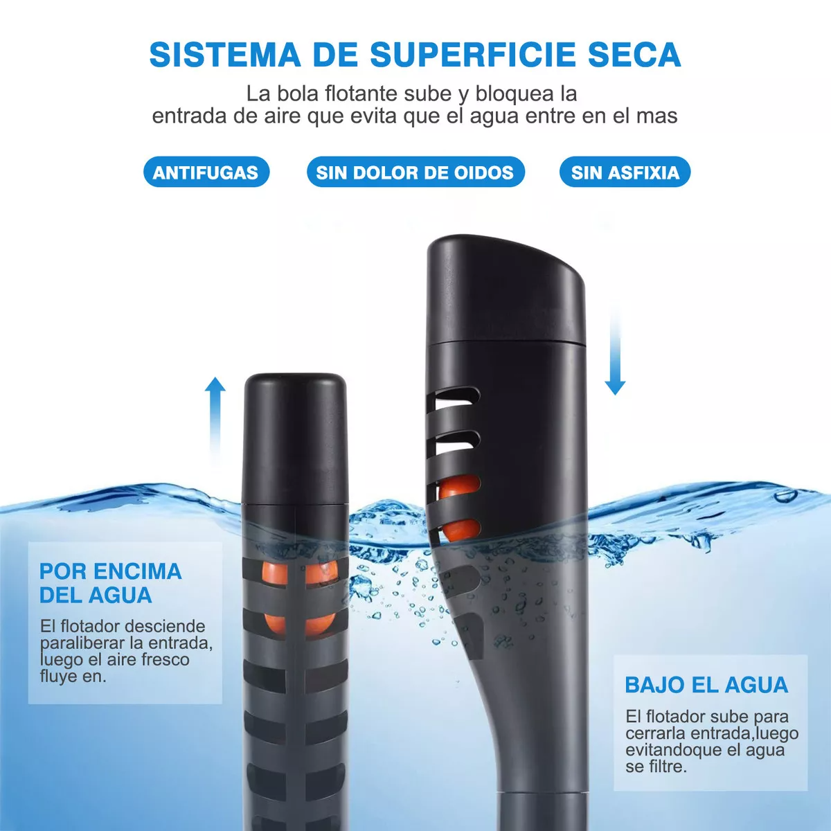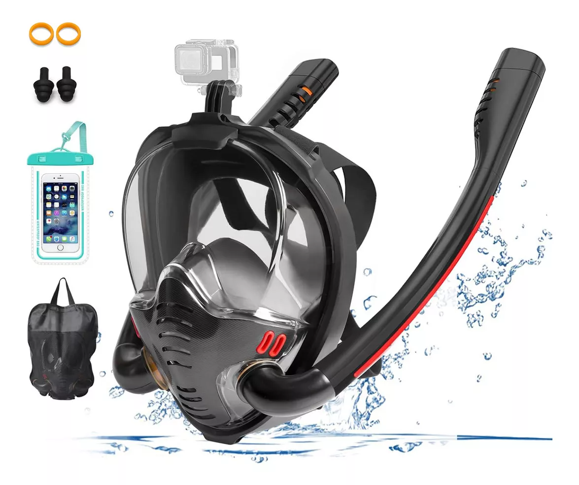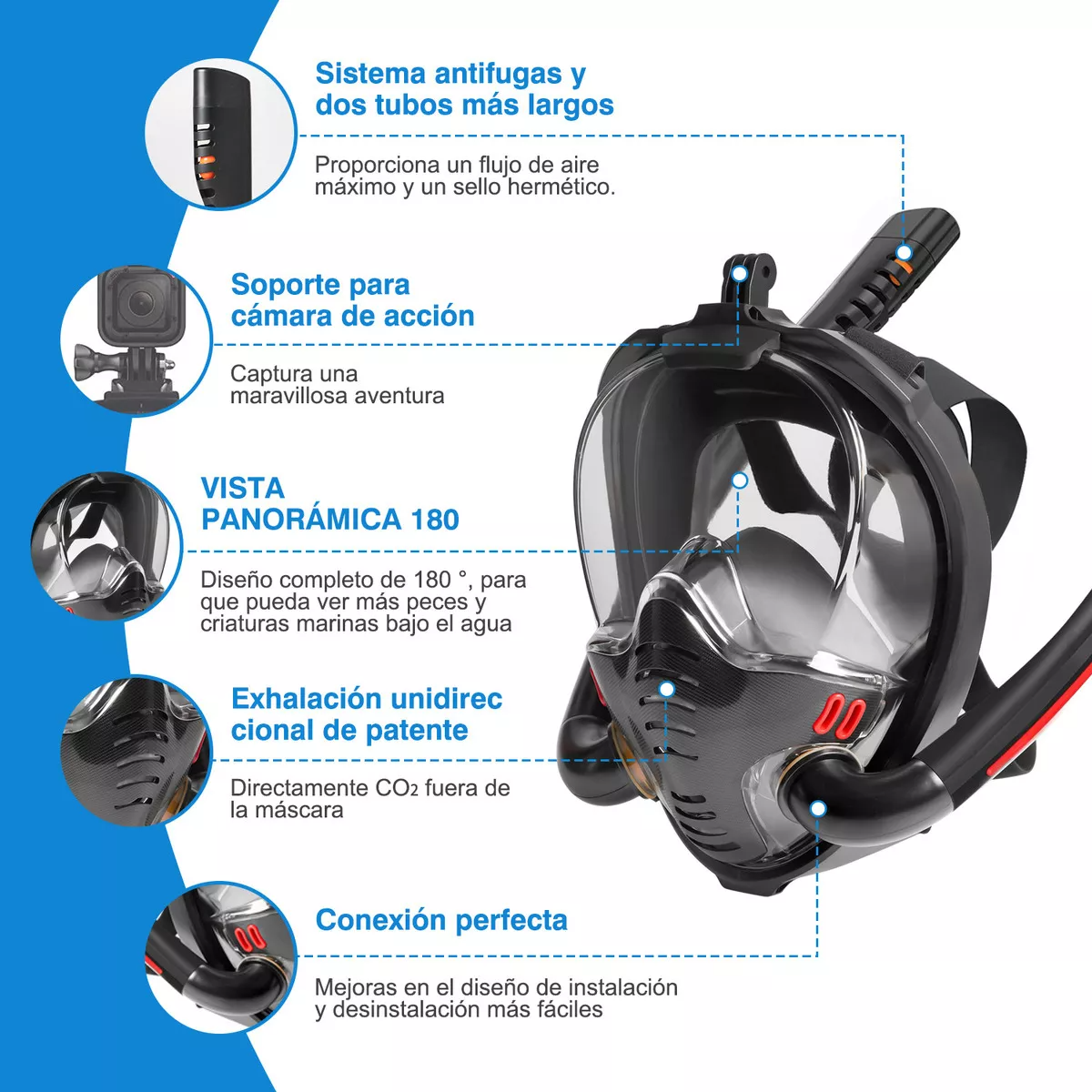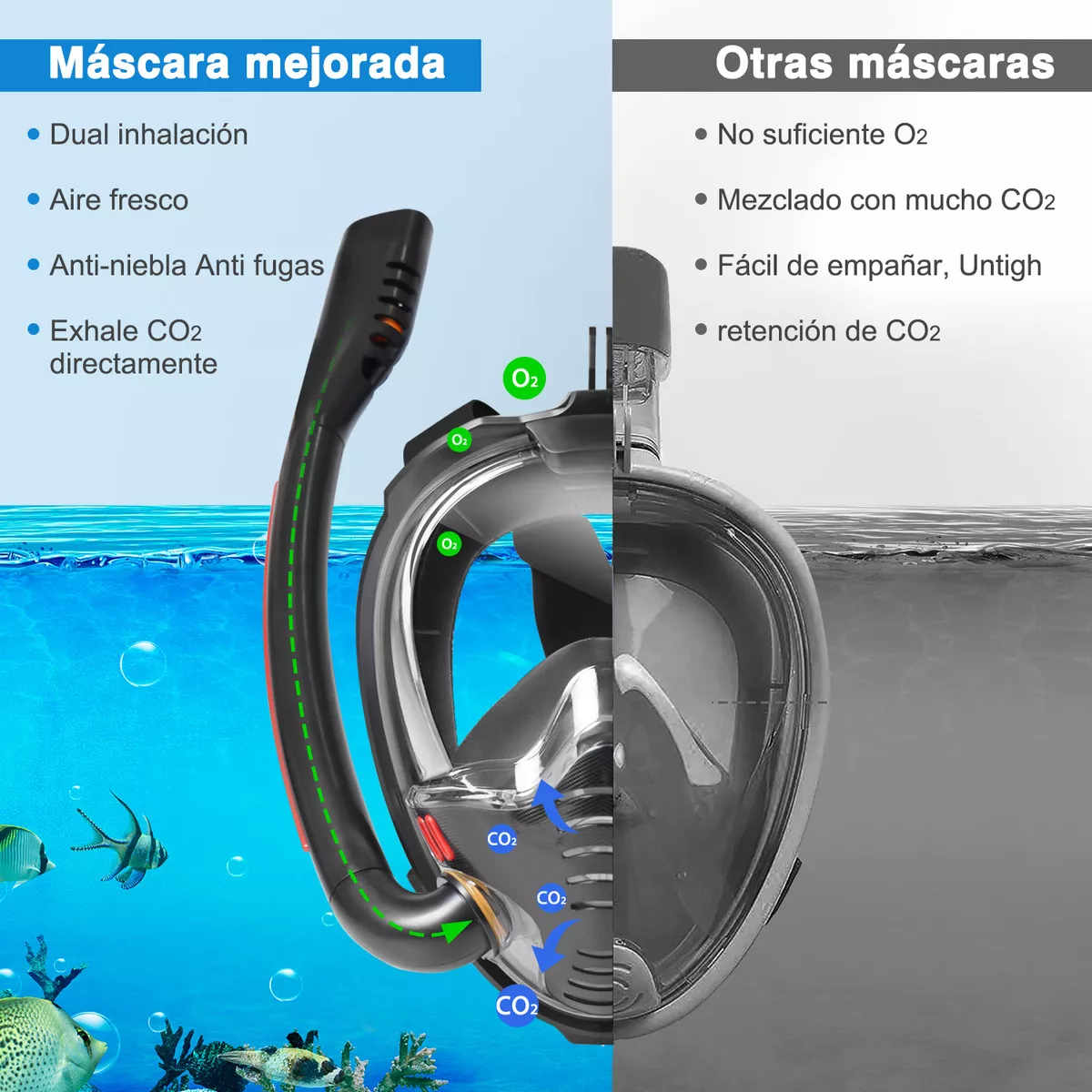 La máscara de snorkel está fabricada con un sistema respiratorio patentado que separa el aire inhalado del aire exhalado, sin que se acumule dióxido de carbono en la máscara de snorkel. El aire fresco entra a través del doble tubo de respiración y el aire exhalado por el buceador de snorkel se exhala a través de una válvula unidireccional en la boca. Este mecanismo garantiza que la concentración de oxígeno en la máscara de buceo sea básicamente la misma que la del aire.