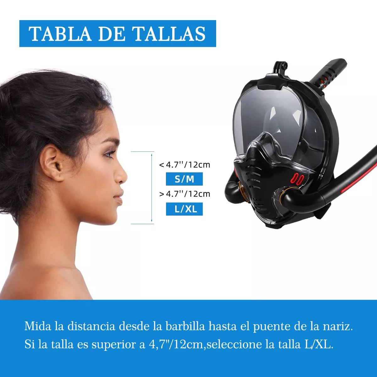La junta de silicona es duradera, se ajusta a la cara y es firmemente impermeable, formando un cómodo espacio impermeable y sellado. El tamaño se mide desde la ceja hasta la parte inferior de la barbilla.