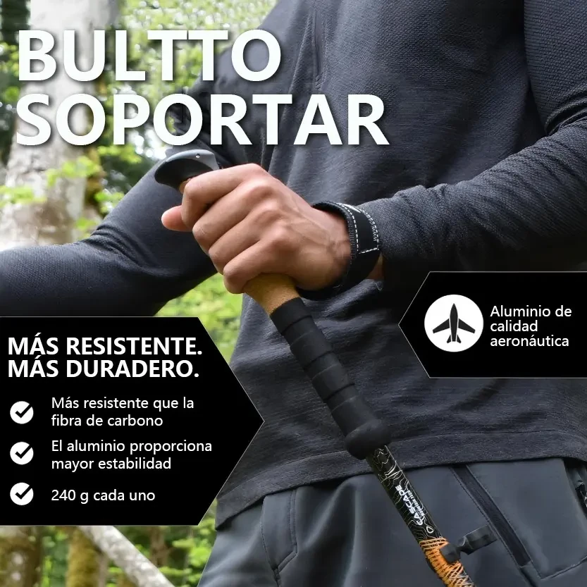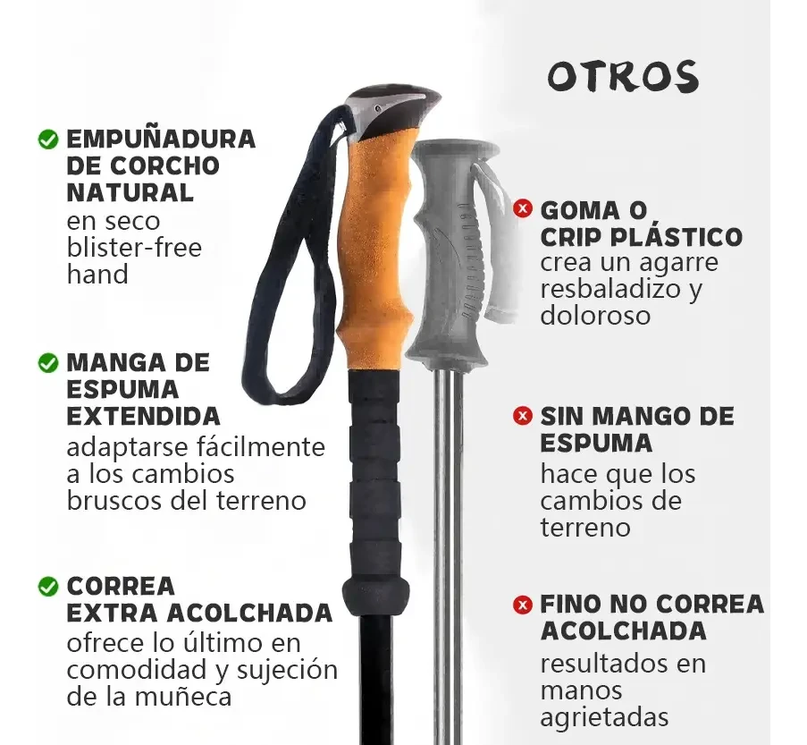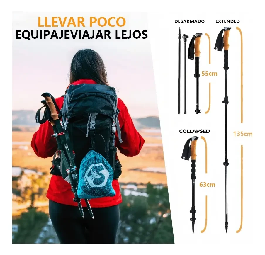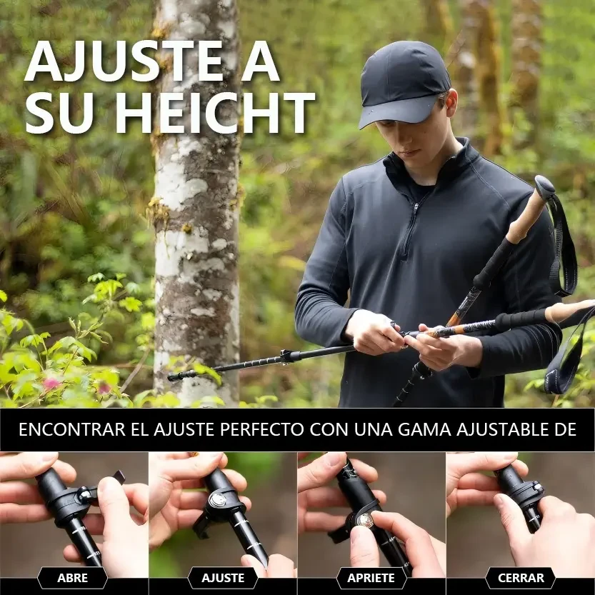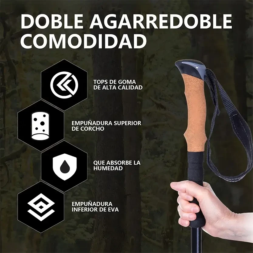 DescripciónContenido del Paquete Bastón de Senderismo ×2 Bandana negra ×1 Mopa redonda ×6 Hebilla ×2 Cubrepies ×2 Cubrepies de Malla ×2 Pies de Acero al Tungsteno ×2 Cubrecalzado ×2 Bolsa de Tela ×1 Material: Aluminio de alta calidad. Peso: Cada bastón de trekking pesa solo 240 gramos. Ajuste de Largo: 62 a 135 cm. Bloqueo Rápido: Botón de bloqueo rápido y broche de aluminio. Plegables: Diseño compacto y fácil de transportar. ----------------------------------------------------------------------------------------------------- Ventajas del Producto Diseño extensible Los bastones de senderismo y bastones para montaña cuentan con un diseño telescópico y plegable de tres pliegues. Puedes ajustar libremente la longitud de 62 cm a 135 cm para adaptarse cómodamente a tu altura después de una fácil instalación. Ultraligeros y Resistentes Nuestros bastones de trekking y bastones trail running están hechos de aluminio de grado aeronáutico, que resiste mejor la presión y los impactos que la fibra de carbono.Un tratamiento de superficie crea un revestimiento protector contra la corrosión, proporcionando un alto nivel de resistencia.Se doblan de aluminio sin romper, lo que los hace ideales para senderismo de larga distancia y viajes donde la durabilidad es la principal preocupación. Diseño ergonómico para protección Nuestros bastones senderismo ofrecen una selección de altura adecuada y vienen con 5 formas diferentes de puntas de goma, lo que mejora la estabilidad en diferentes terrenos.El mango de espuma EVA absorbe el sudor, con un diseño de ranura antideslizante y cómodo.Las correas de muñeca son ajustables, lo que te permite relajar ligeramente tu agarre y transferir parte de la presión a tu brazo. Características Especiales Empuñadura de Corcho con función antichoque El mango de corcho de nuestros bastones para montaña ofrece una comodidad superior gracias a su excelente capacidad de absorción de humedad, manteniendo tus manos secas y cómodas en todo momento. Además, su agarre ergonómico está diseñado para adaptarse a la forma natural de tu mano, reduciendo la fatiga y proporcionando un agarre seguro incluso en largas caminatas. Aunque el corcho es notablemente ligero, es extremadamente durable y resistente al desgaste, garantizando una larga vida útil del producto.Una ventaja adicional es que, al no contar con un sistema de amortiguación, la transferencia de energía es más directa, permitiendo una mejor propulsión en cada paso.Este beneficio es especialmente apreciado por senderistas experimentados que prefieren sentir el terreno y maximizar su energía, especialmente en subidas empinadas. Con Mango EVA con Antishock Nuestros bastones de senderismo están diseñados para ofrecer la máxima comodidad y eficiencia en cada paso de tu aventura al aire libre. Equipados con un mango de EVA, proporcionan un agarre suave y cómodo al tacto, ideal para largas caminatas.El material EVA no solo ofrece una sensación agradable, sino que también es excepcional en la absorción de impactos, reduciendo las vibraciones y el impacto en tus manos y muñecas para que puedas disfrutar de una experiencia de senderismo con menos molestias y fatiga. La absorción de impactos también se ve potenciada por nuestro avanzado mecanismo de antishock, que absorbe eficazmente el impacto generado al caminar sobre terrenos irregulares. Este sistema reduce significativamente la presión sobre las articulaciones, especialmente en las rodillas, caderas y tobillos.Esta característica es una ventaja clave para quienes buscan proteger sus articulaciones durante caminatas prolongadas, disminuyendo la fatiga y el riesgo de lesiones, proporcionando mayor comodidad durante toda la travesía. |