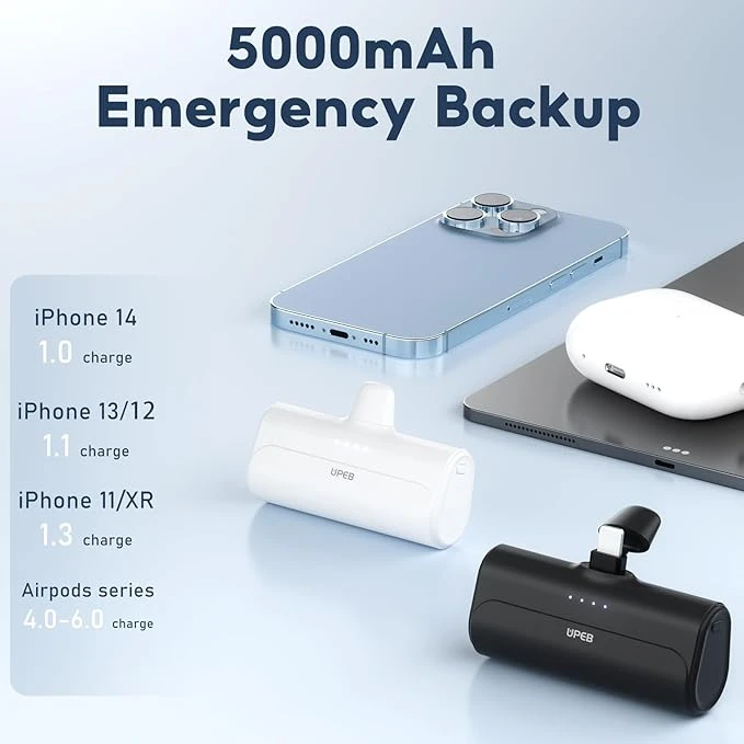 | Tipo de conector | Lightning, USB Tipo C | | Marca | UPEB | | Capacidad de la batería | 5000 Milliamp Hours | | Color | Blanco y negro | | Característica especial | Auto Shut-Off, LED Indicator Lights, Tamaño de bolsillo, Slim, Built In Cable |