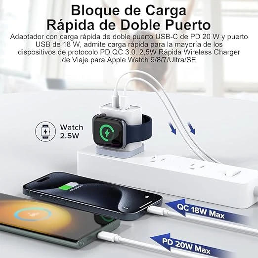 - 💗【Cargador Inalámbrico 3 en 1】El adaptador de cargador con puerto dual y cargador inalámbrico, ladrillo de cargador rápido de 3 salidas. Puerto USB-C de PD 20 W y puerto USB de 18 W, Carga Rápida compatible con iPhon, galaxy, huawei, Pods, tabletas. 2,5 W Rápida wireless charger compatible con la serie iPhon Watch. Puedes cargar 3 dispositivos simultáneamente.