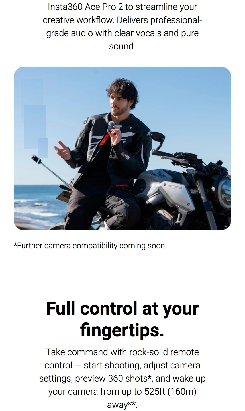 Microfono integrado de alta calidad:Registra sonidos nítidos con el microfono integrado del Insta360 X5 GPS remoto. Diseño personalizable con GPS:Personaliza tu Insta360 X5 GPS remoto con fondos de pantalla personalizados y datos GPS. Transmisión estable de 160m:Mantenga el control hasta 160m con el Insta360 X5 remoto, para una experiencia de grabación sin interrupciones. Compatibilidad con Insta360 Ace Pro 2 : Optimiza tu cámara de acción con el Insta360 X5 GPS remoto, diseñado para la serie Ace Pro 2. Insta360 X5 Remote|Insta360 X5 Remote Control|Control remoto Insta360 X5 con GPS:Monitoriza tus aventuras con el control GPS de Insta360 X5, ideal para capturas de acción. Detalles