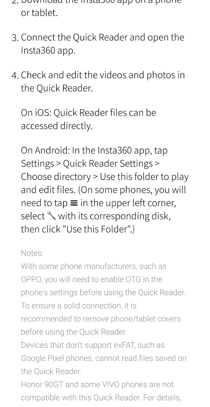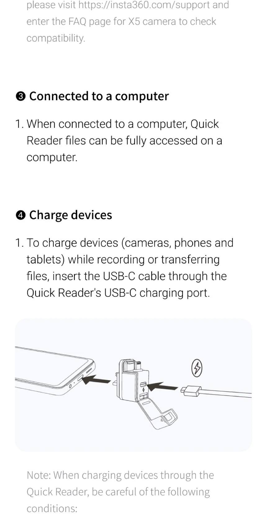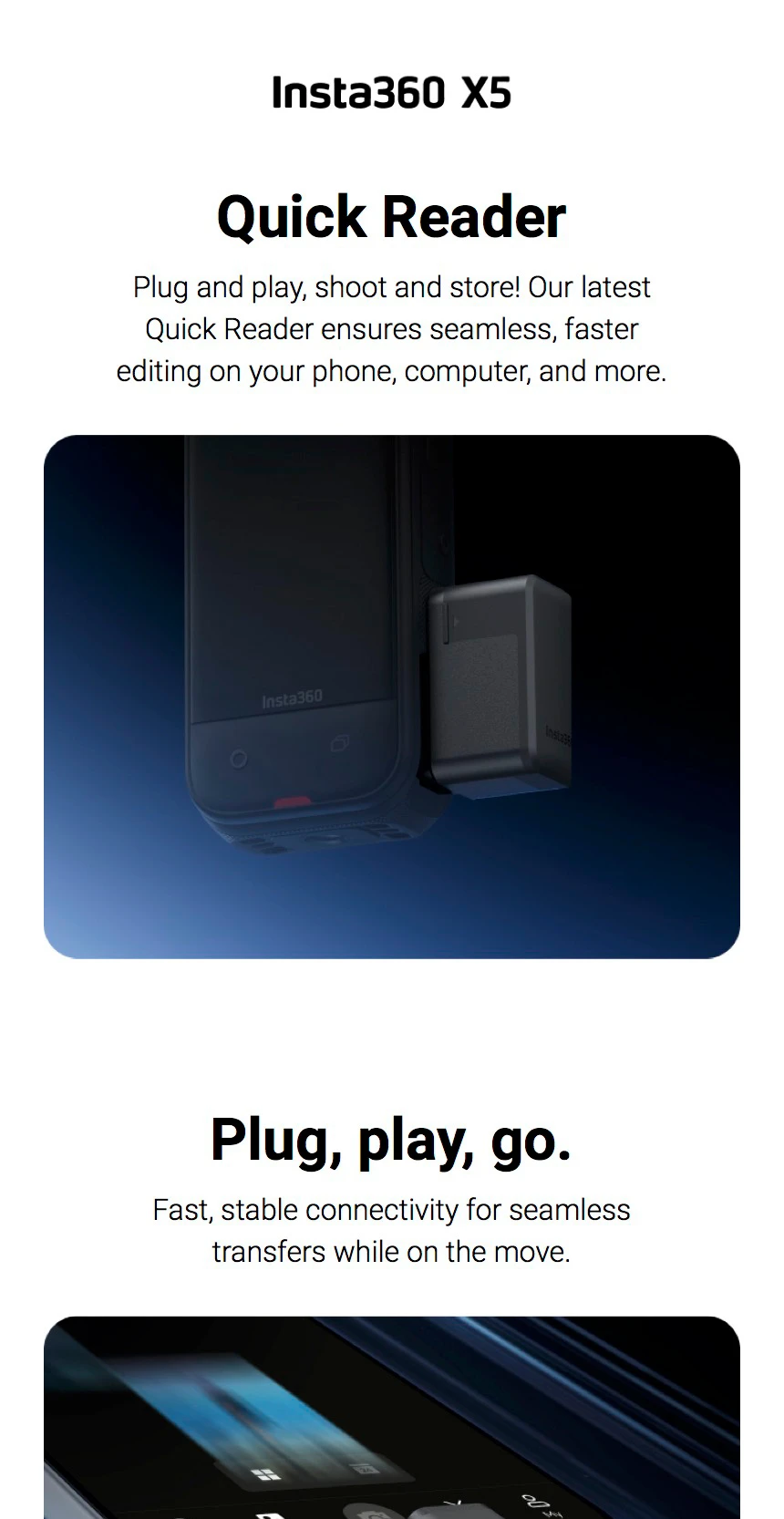Adicional de ranura de memoria : Asegura más almacenamiento con ranura extra para tarjetas, ideal para capturas prolongadas. Portátil de carga USB-C:Incluye puerto USB-C para cargar su teléfono mientras trabaja con Insta360 X5. Diseño dual compatible:Compatible con iOS y Android, el lector insta360 x5 es versátil y fácil de usar. Transferencias USB-3.0 rápidas:Transfiere archivos grandes a una velocidad superior, optimizando el tiempo de trabajo. Conexión plug and play:Conéctese directamente a su teléfono para editar y exportar de forma rápida y sin complicaciones. Detalles