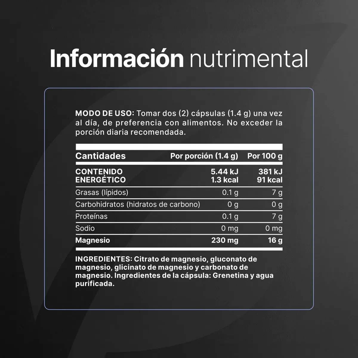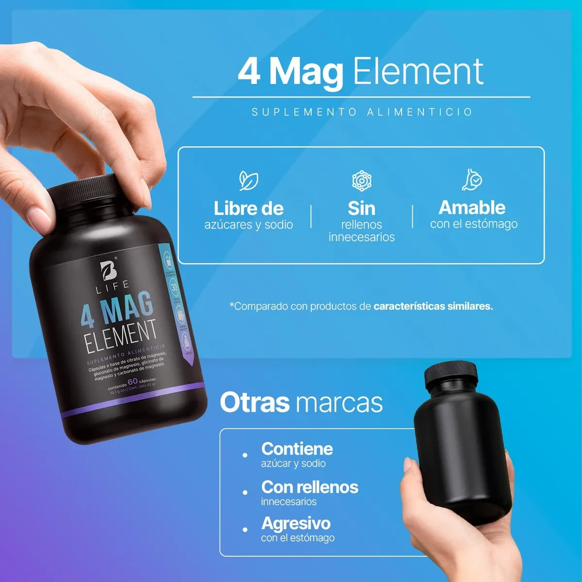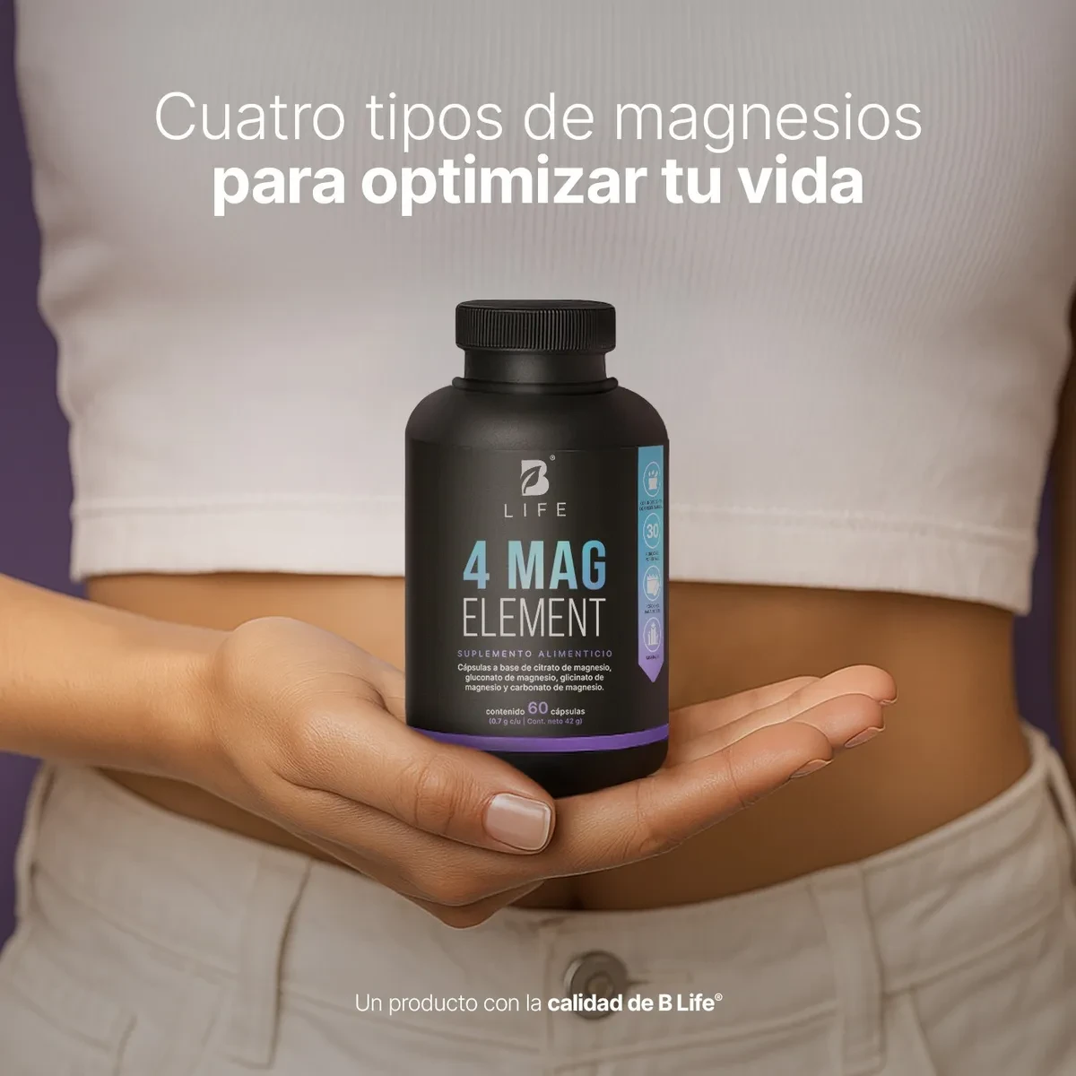 Descripción4 Mag Element B Life – Magnesio en 4 Formas para tu Rutina Diaria ¡Optimiza tu día con 4 Mag Element de B Life! Cada porción de 2 cápsulas (1.4 g) aporta 230 mg de magnesio elemental proveniente de una mezcla de cuatro fuentes: citrato, gluconato, glicinato y carbonato de magnesio, a diferencia de otras fórmulas que solo incluyen de 1 a 3 tipos de magnesio. Para tu bienestar: - Mezcla completa de magnesio: citrato, gluconato, glicinato y carbonato. Cada tipo aporta propiedades distintas que se complementan para una absorción óptima y suavidad digestiva. - Porción práctica: 2 cápsulas diarias aportan la cantidad precisa de magnesio elemental. - Fórmula limpia y confiable, elaborada con ingredientes naturales de alta calidad. - Presentación conveniente: 60 cápsulas por frasco = 1 mes de consumo. - Complemento para la ingesta diaria de magnesio, pensado para acompañar tu estilo de vida activo y saludable. Modo de uso sugerido: Tomar 2 cápsulas al día, preferiblemente con los alimentos. Este producto no es un medicamento; su consumo es responsabilidad de quien lo recomienda y quien lo usa. Garantía del vendedor: 30 días |